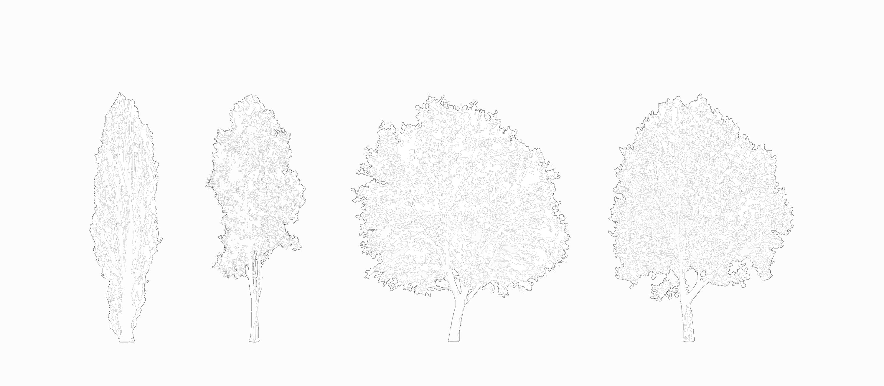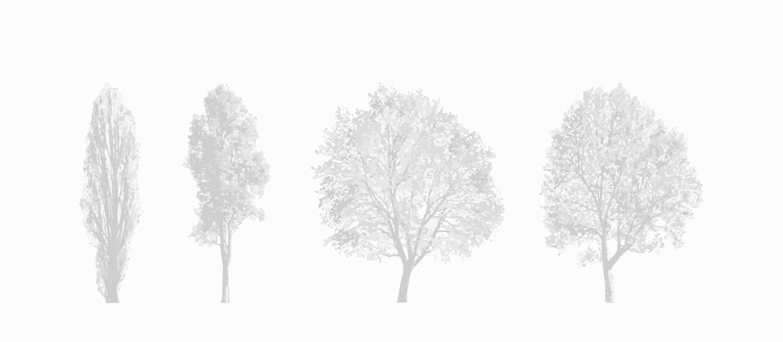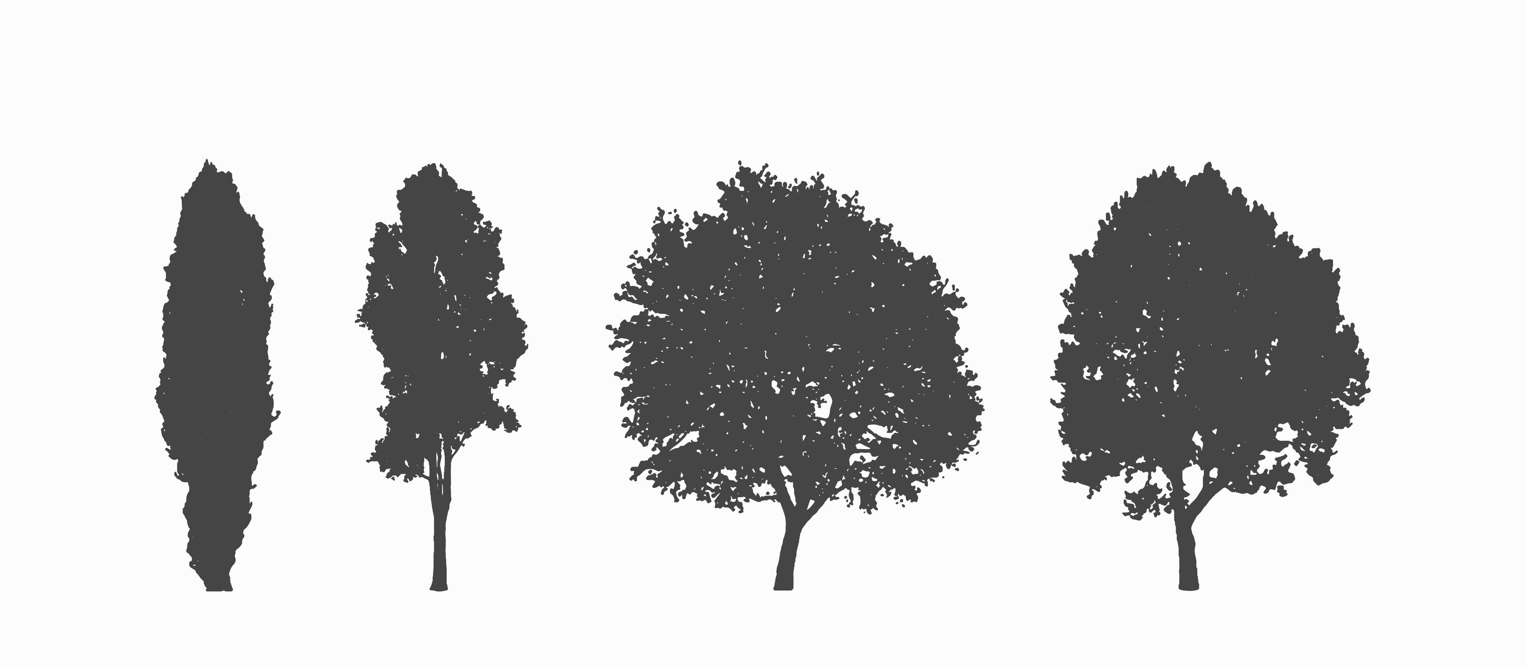 WIDE VARIETY OF TREE TYPES, SHAPES, AND SIZES / SHRUBS AND PEOPLE DRAWINGS MATCHING THE GRAPHIC STYLES OF THE TREES