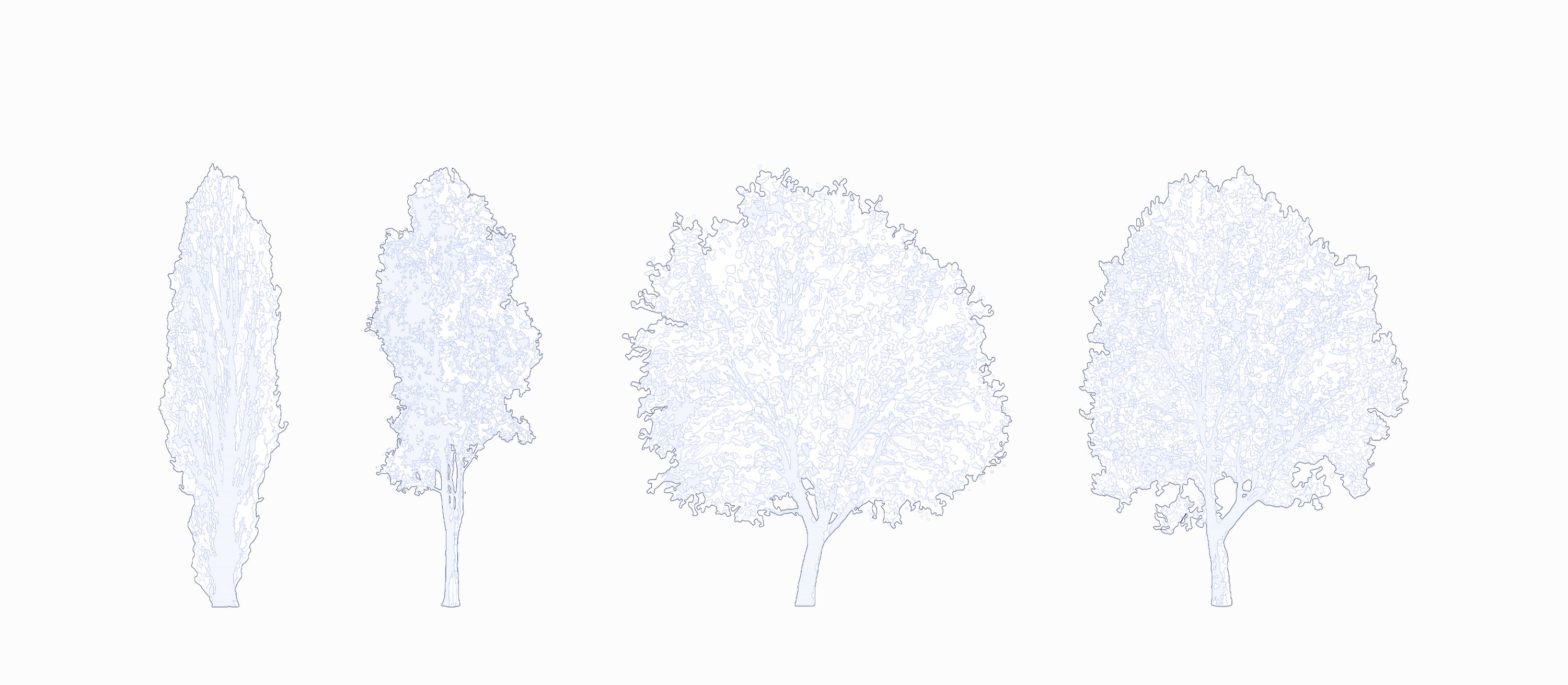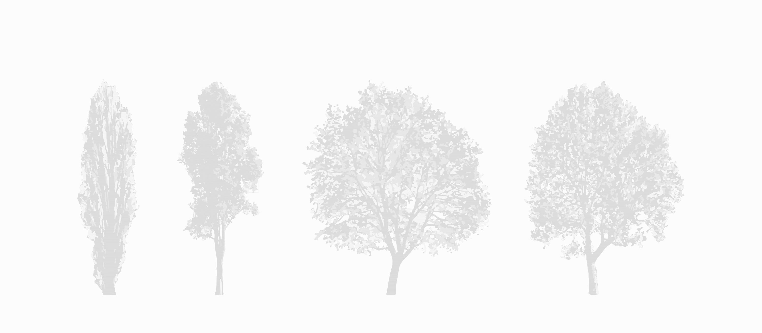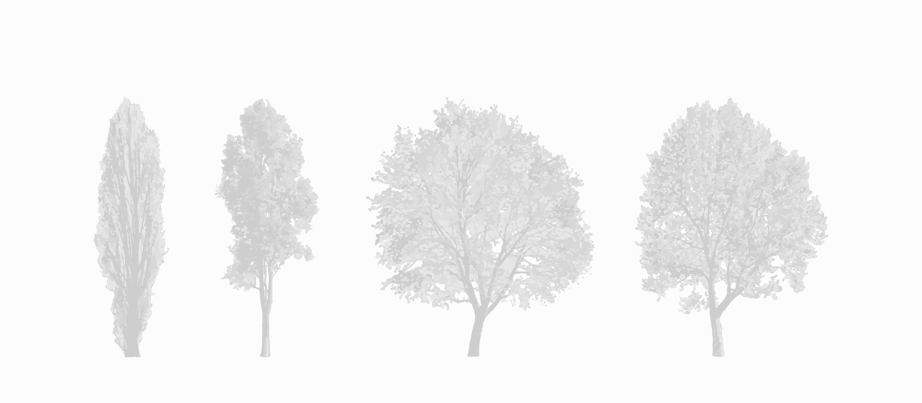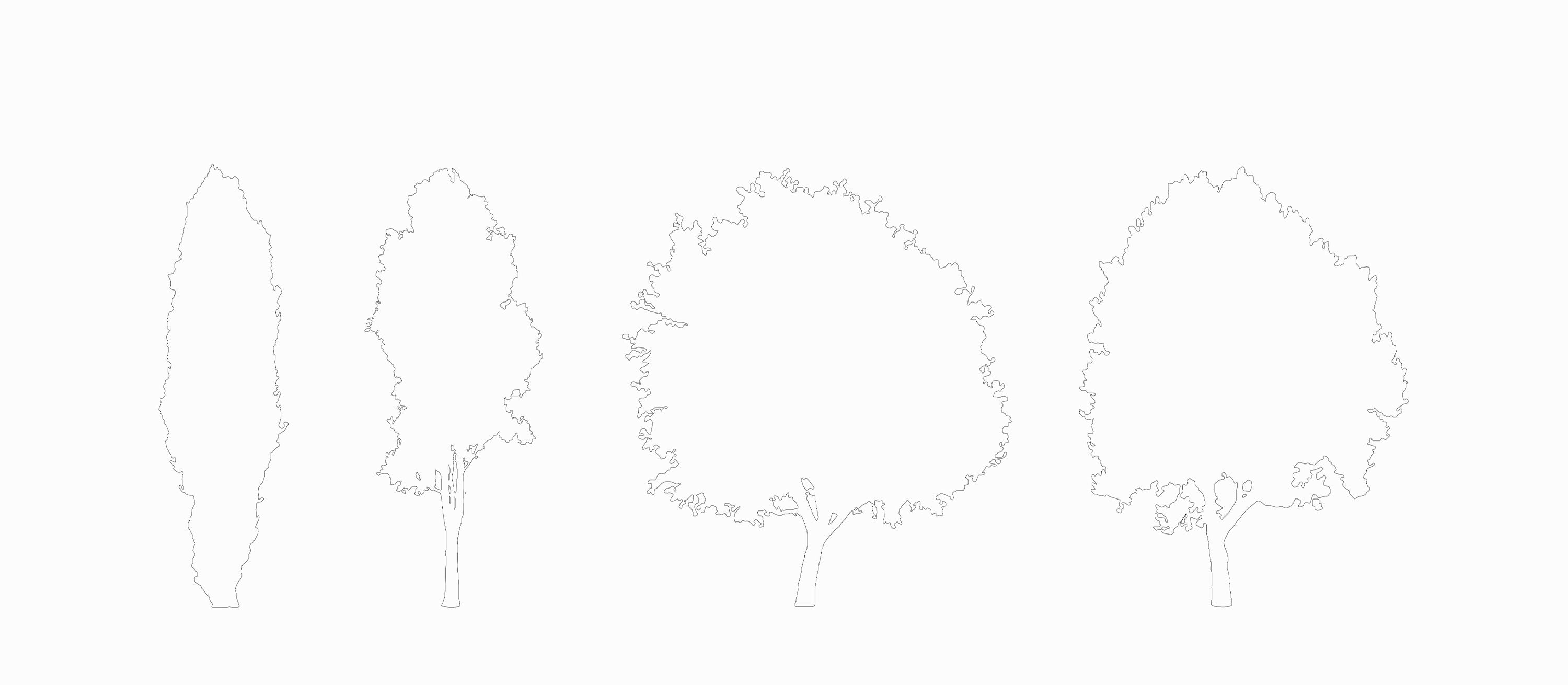 WIDE VARIETY OF TREE TYPES, SHAPES, AND SIZES / SHRUBS AND PEOPLE DRAWINGS MATCHING THE GRAPHIC STYLES OF THE TREES